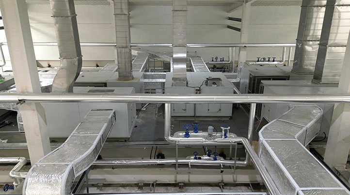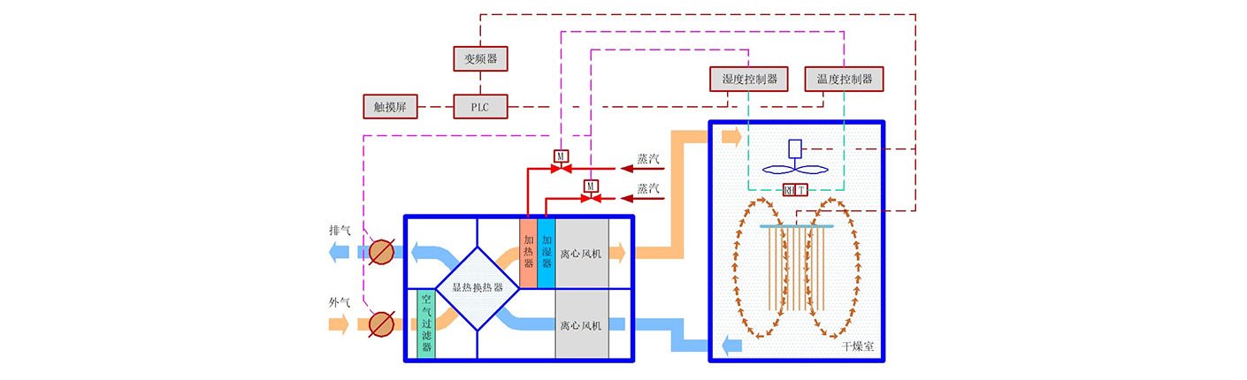 ◆ 進排風及熱風攪拌系統(tǒng)將處理過的熱風送入室內(nèi)各處,從室內(nèi)各處返回機組、部分排出室外,優(yōu)化各進排風口的位置。不同干燥區(qū)攪拌風扇的風速可調(diào),確保室內(nèi)各處的溫濕度均勻。