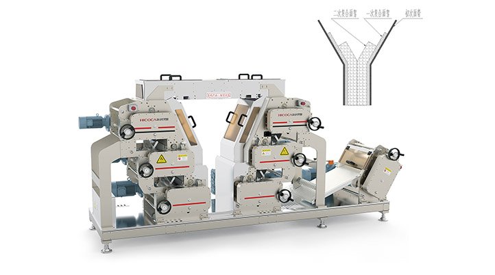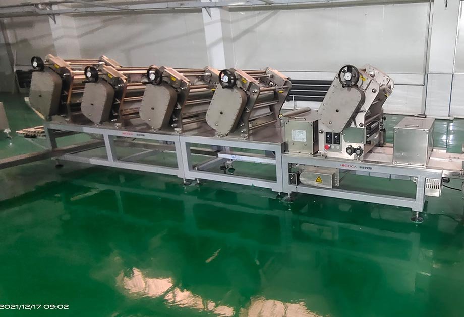 ◆ 面帶經(jīng)過連續(xù)壓延輥壓成細(xì)密的、達(dá)到規(guī)定厚度要求的薄面片,形成更為完善的面筋網(wǎng)絡(luò),面帶水分分布更加均勻,面帶具有一定的韌性和強(qiáng)度。