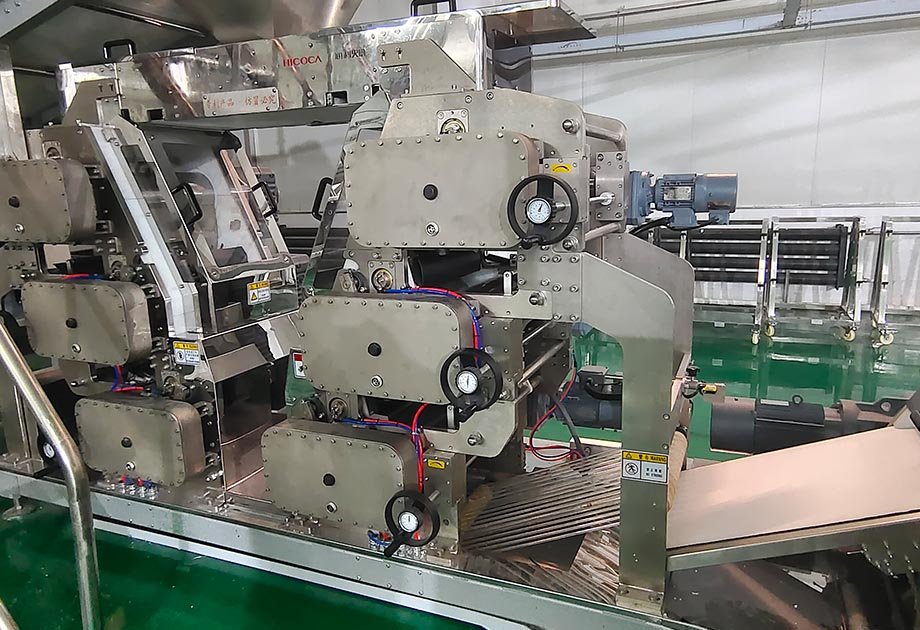 3、連續(xù)自動(dòng)運(yùn)行,實(shí)現(xiàn)面帶與面絮六層復(fù)合的面帶結(jié)構(gòu),使面條具有外滑內(nèi)軟、外密內(nèi)松、爽滑Q彈的獨(dú)特效果。