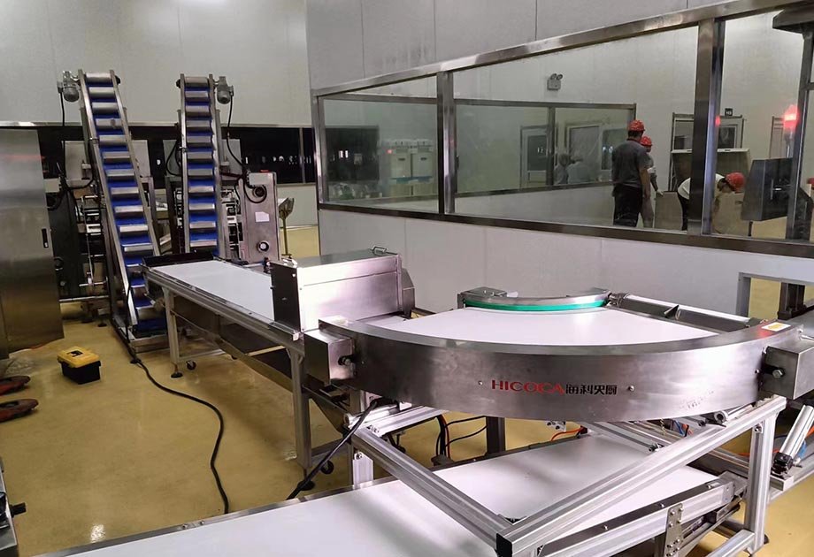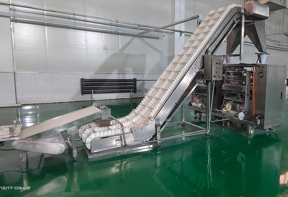 應(yīng)用范圍:完成對鮮濕面、水餃、湯圓、小饅頭等類似產(chǎn)品的輸送、塑料袋包裝全過程。