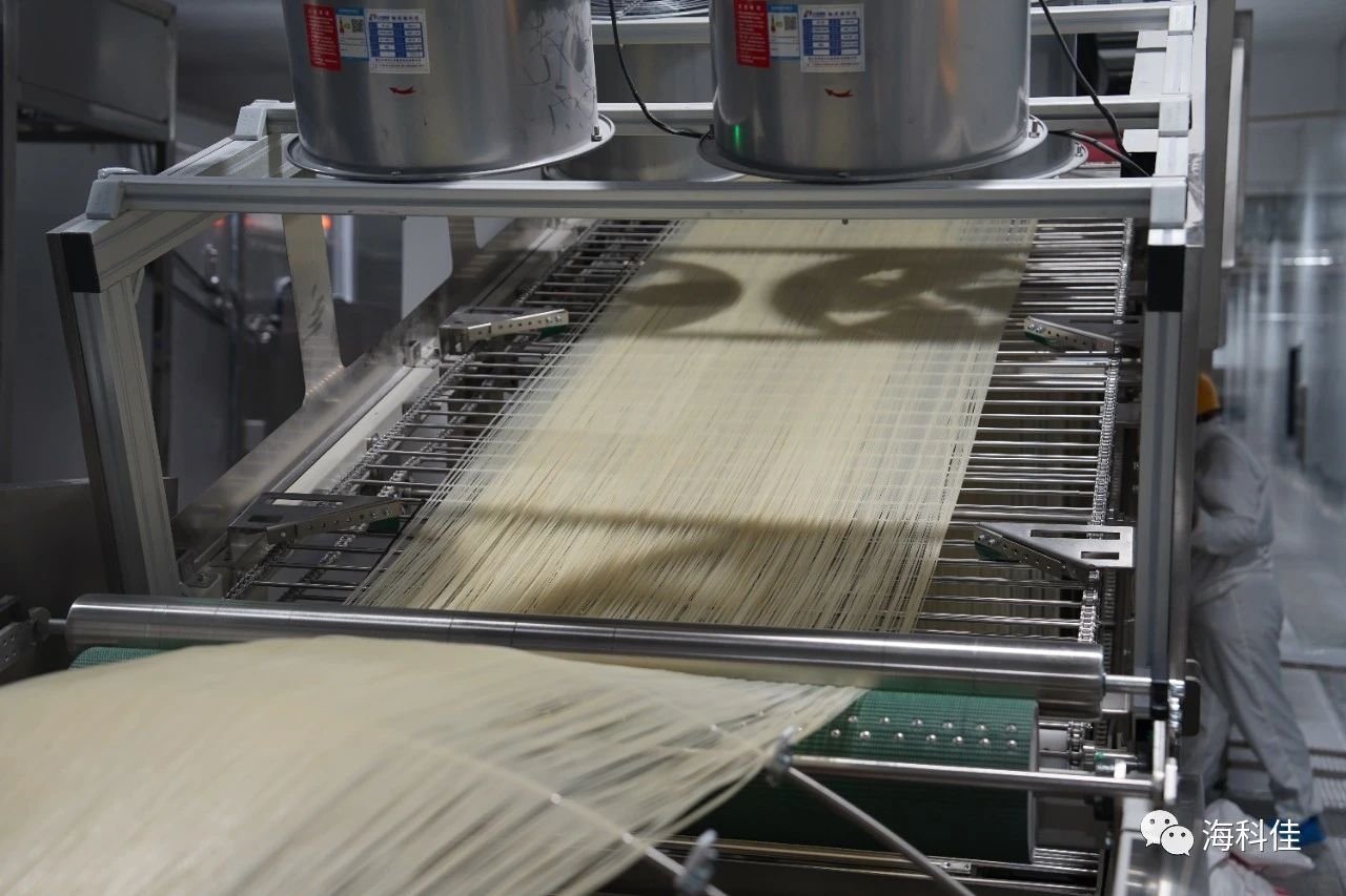 由青島??萍阎圃斓拿追凵a(chǎn)線裝備,通過全過程的智能控制系統(tǒng),保證了全過程產(chǎn)品品質(zhì)、效率和效益的優(yōu)化,實現(xiàn)了大產(chǎn)能、規(guī)?;a(chǎn),完成了從配米制粉、制熟擠絲、老化松絲、自動搓散、節(jié)能干燥、切粉輸送、稱量包裝的全過程自動化生產(chǎn),是國內(nèi)首條全流程直條米粉自動化生產(chǎn)裝備,填補了米粉全產(chǎn)線關(guān)鍵工藝技術(shù)的國內(nèi)外空白,是世界上首條產(chǎn)能最高、用工最少的智能化米粉生產(chǎn)線。