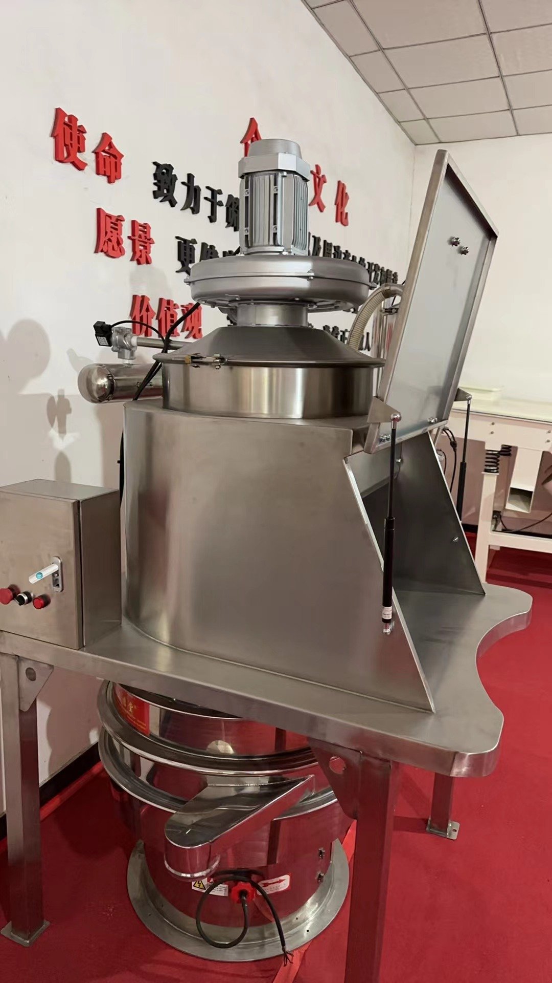5)離心風(fēng)機(jī):是整個(gè)除塵系統(tǒng)的動(dòng)力元件,用來形成一定負(fù)壓,阻止粉塵外泄,并抽走篩分物料時(shí)彌漫的粉塵,方便設(shè)備操作。
