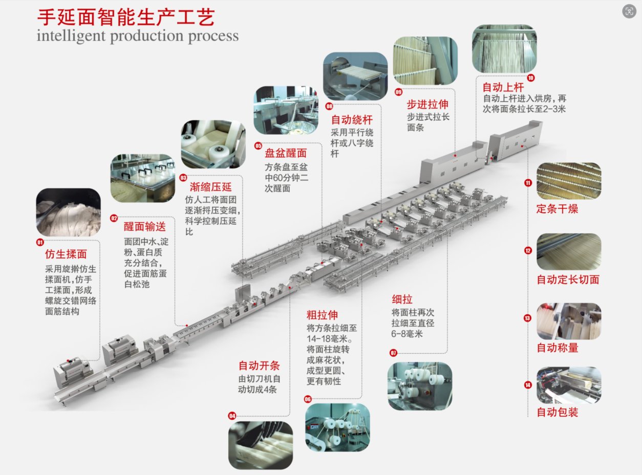 同時該產(chǎn)線智能化程度高,產(chǎn)能高效,可實現(xiàn)10-20噸/天的產(chǎn)能,是人工制面效率的8-10倍,是目前產(chǎn)能最大的全自動手延面生產(chǎn)線。